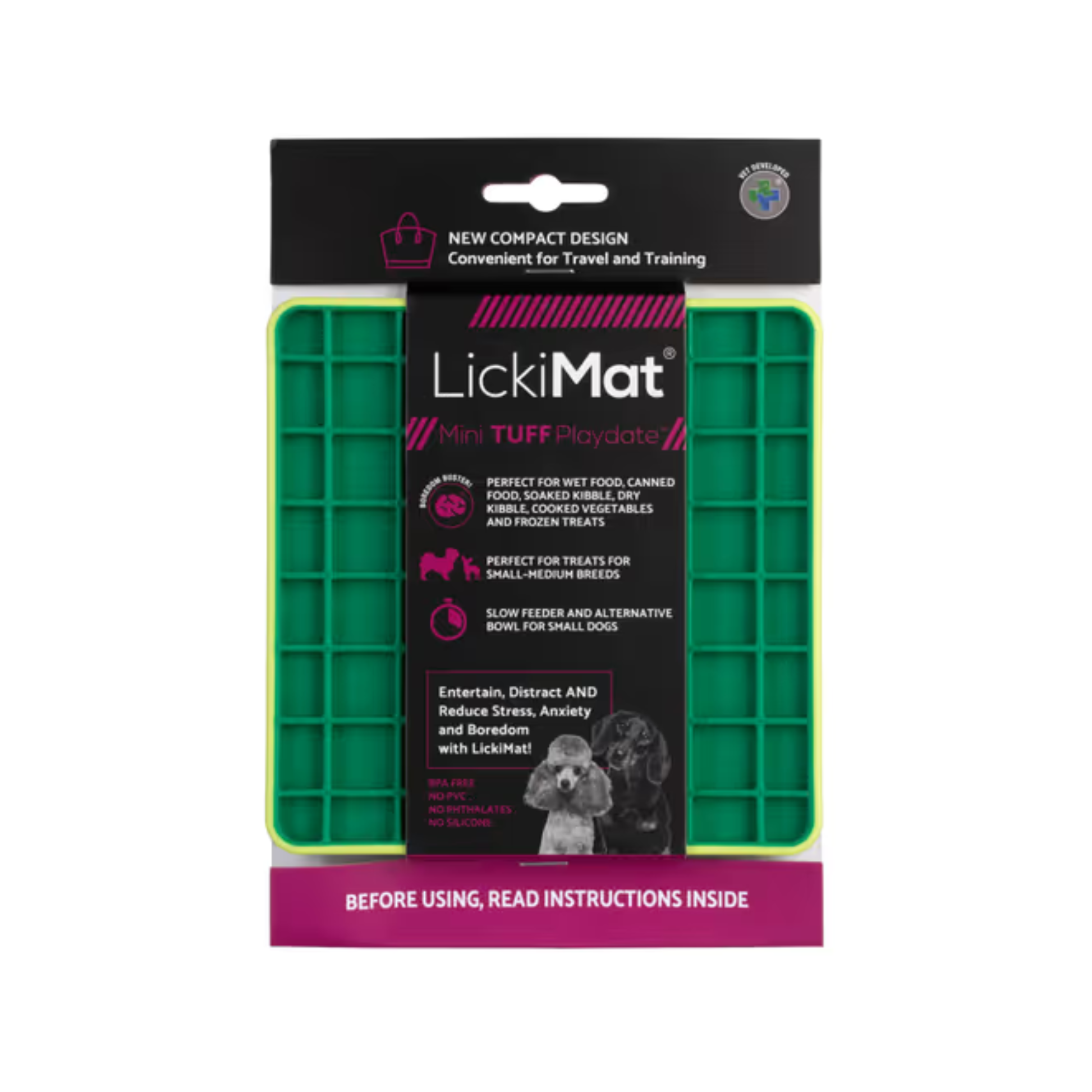 The Lickimat Mini Tuff Playdate Lickmat is a durable and engaging product by Lickimat. The mini size is perfect for playtime interaction and the tuff material ensures long-lasting use. Keep your pet entertained and satisfied with this lickmat.