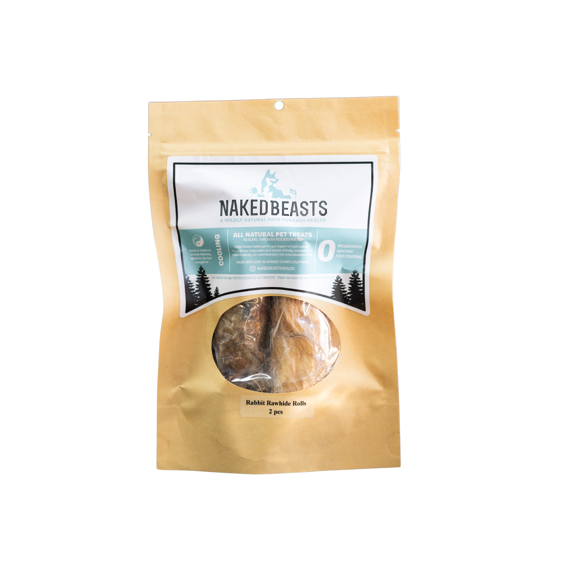 They are rolled inside out with the fur on the inside and are an in between size of the giant rabbit rawhides and the rabbit rawhides mini.