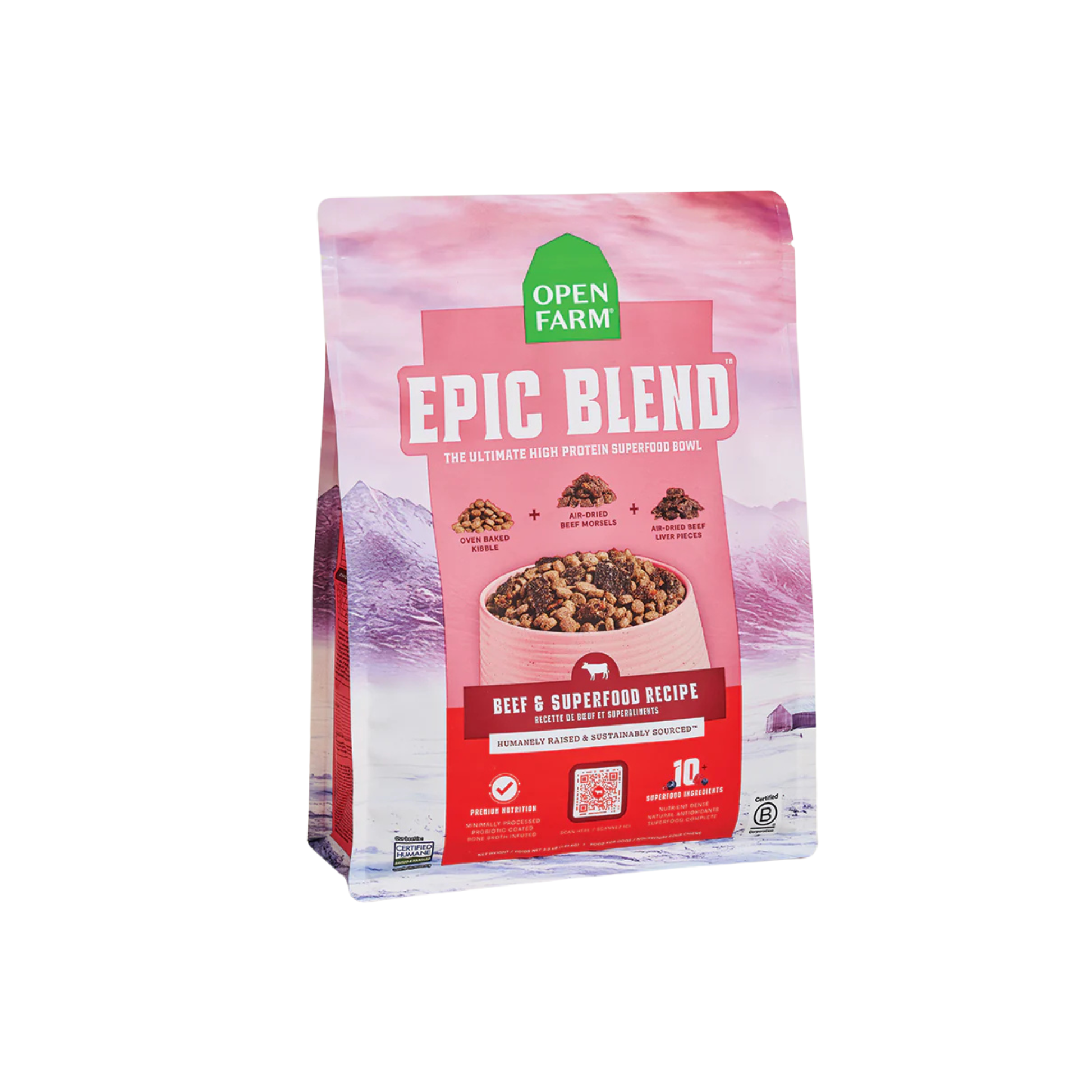 Fuel your dog’s vitality with Open Farm Epic Blend Beef & Superfood Dry Dog Food. This nutrient-rich recipe features Certified Humane® grass-fed beef as the first ingredient, blended with over 10 superfoods including blueberries, kale, and turmeric for a powerful nutritional boost.