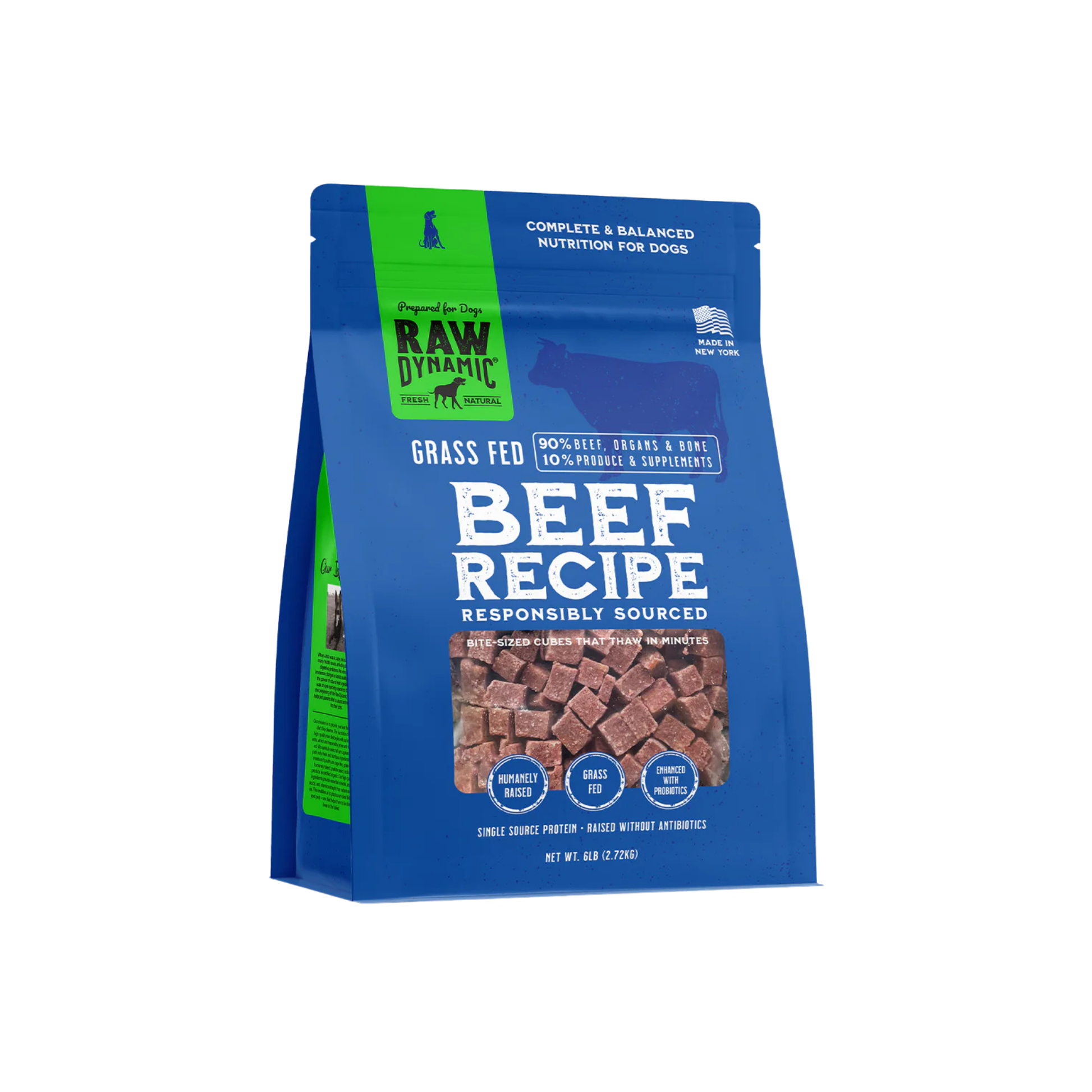 Give your dog a biologically appropriate meal with Raw Dynamic Frozen Raw Beef Formula for Dogs. Made with raw grass-fed beef, organs, and organic fruits and vegetables, this frozen recipe delivers natural protein and essential nutrients in a simple, wholesome formula. Convenient cube-shaped portions thaw quickly, making raw feeding easy while supporting digestion, muscle health, and overall vitality.