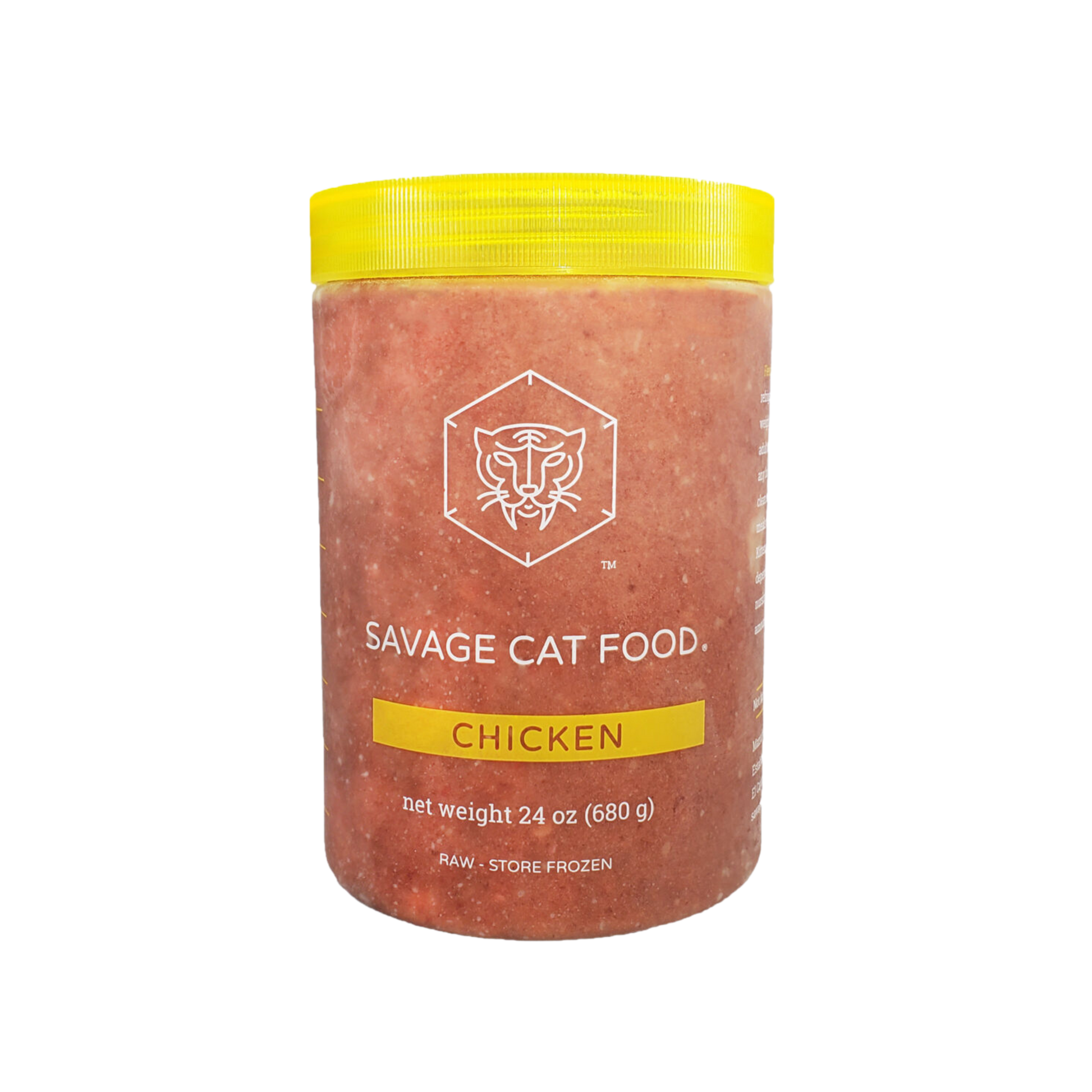Frozen raw cat food made from California certified organic chicken. Whole chicken is ground with bones and organs, then mixed with egg yolks and supplements. Available in 12 oz and 24 oz tubs.