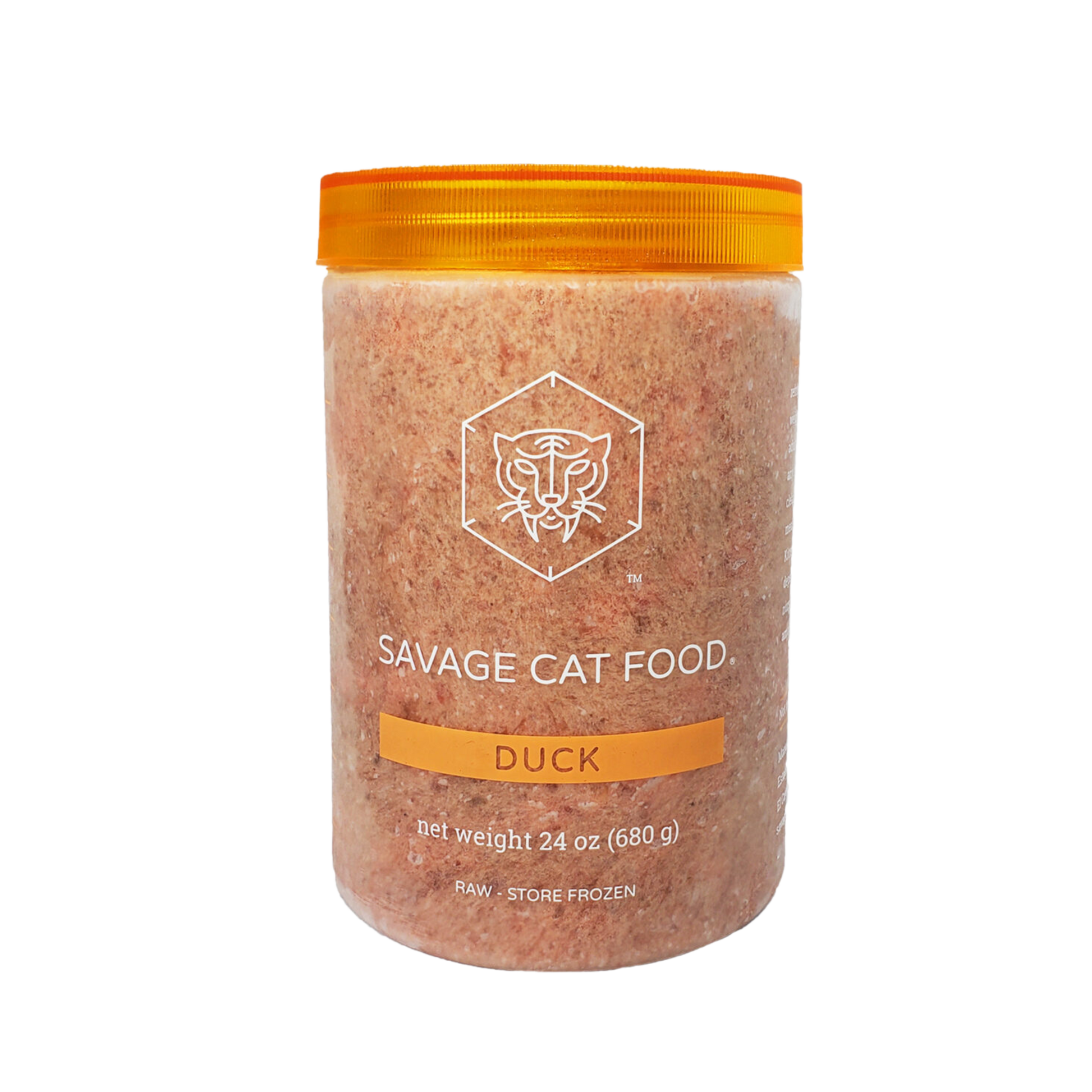 Frozen raw cat food made with California duck. Single protein, no fish oils, great for cats with allergies or who need a food with a slightly higher fat and calorie content. Whole ducks are ground with bones and organs, then mixed with egg yolks and supplements. Available in 12 oz and 24 oz tubs.