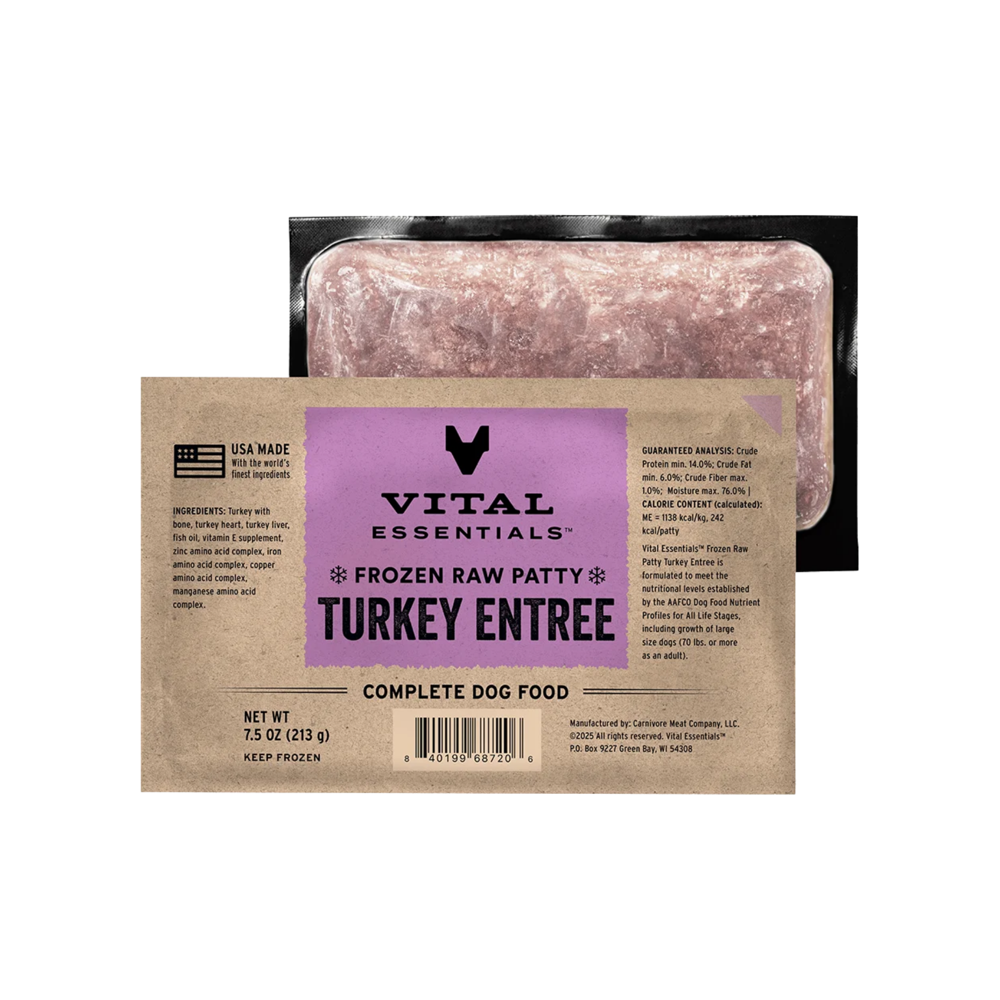 Enhance your dog’s meals with Vital Essentials Frozen Raw Turkey Entree, a protein-rich, biologically appropriate raw diet made with high-quality whole animal ingredients. Crafted with turkey, organs, and bone, this frozen raw recipe delivers essential nutrients, natural enzymes, and amino acids to support muscle development, digestion, and overall vitality while providing a fresh, species-appropriate meal dogs thrive on.
